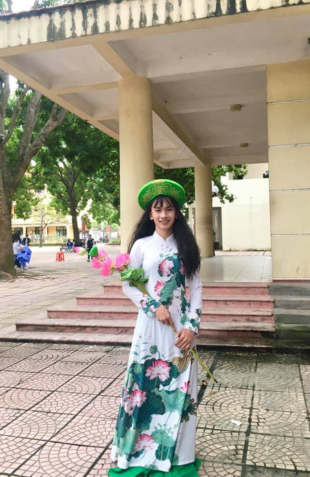Nam sinh diện áo dài truyền thống và đội tóc giả. Vì thân hình vốn mảnh khảnh nên anh chàng này chỉ cần độn thêm phần trên là có vóc dáng chuẩn không khác gì Hoa hậu. Nụ cười tỏa nắng cùng vẻ bẻn lẽn siêu đáng yêu khi lần đầu giả gái khiến cậu học trò liên tục nhận về nhiều bình luận khen ngợi.