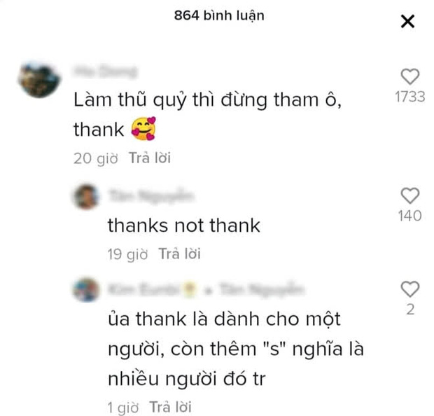Cụ thể trong một video, nam sinh này bình luận: "Làm thủ quỹ thì đừng tham ô, thank". Chủ tus sau đó đã đáp trả lại: "Thanks not thank". Nhưng ai ngờ, cậu bạn này vẫn cãi cố, còn biện luận rằng: "Thank là dành cho một người, còn thêm 's' nghĩa là nhiều người đó trời".
