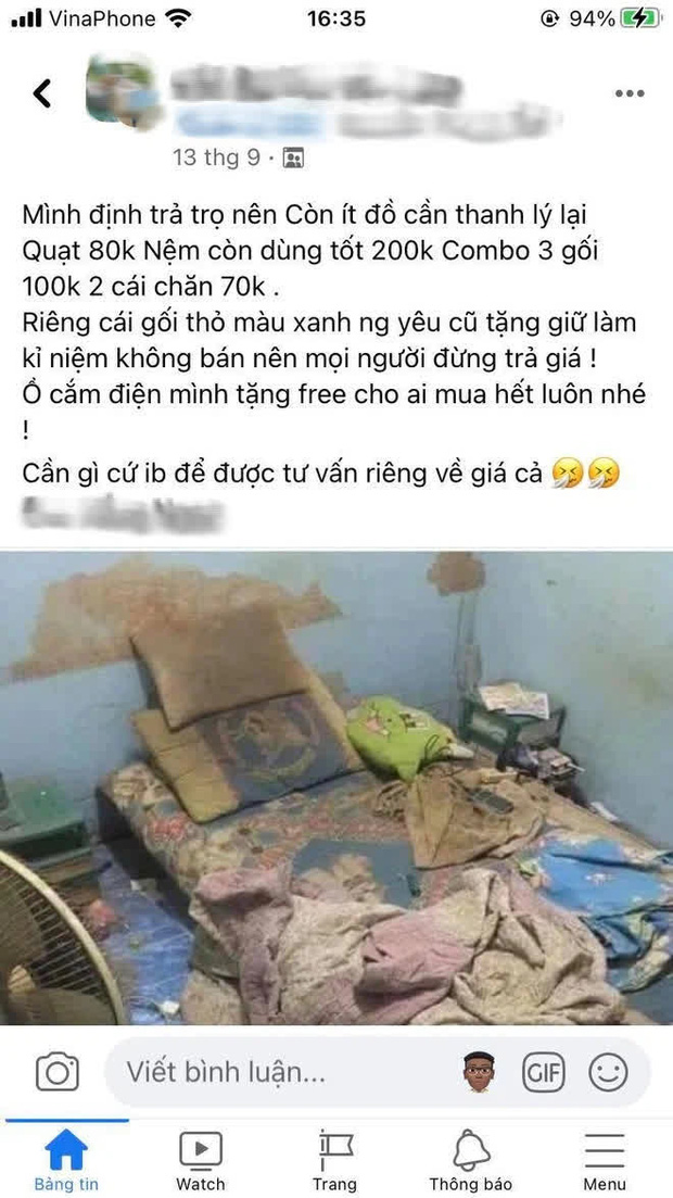 Theo đó, một sinh viên sắp trả trọ nên cần thanh lý lại các đồ dùng mình có với giá khá tốt: Quạt 80k, nệm 200k, combo 3 gối 100k, 2 cái chăn 70k, được tặng free ổ điện cho ai mua hết. Nhưng chắc chẳng ai dám liên lạc với chủ nhân của những món đồ này nếu nhìn thấy căn phòng nhếch nhác.