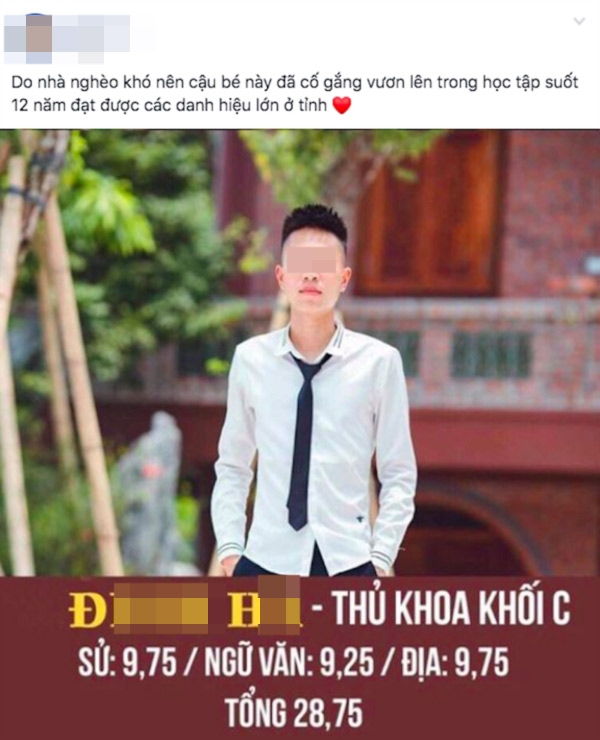Kèm theo bài chia sẻ là hình ảnh nam sinh này cùng thông tin là thủ khoa khối C với số điểm 28.75 trong đó Lịch sử đạt 9.75, Ngữ văn 9.25 và Địa lí là 9.75.