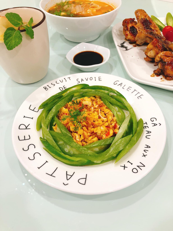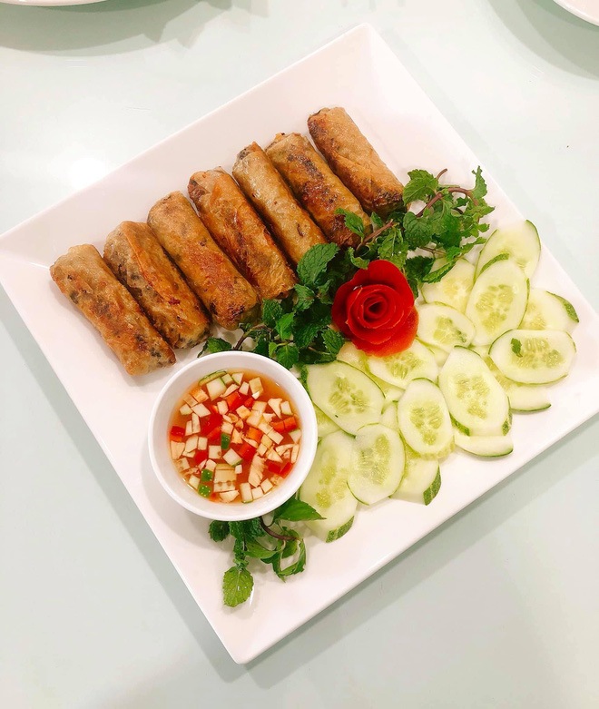 Xem những hình ảnh chụp thành quả của nam thanh niên này có thể thấy, những món ăn anh chế biến có thể "bình dân" thật, toàn là những món quen thuộc trong các gia đình, thế nhưng tay nghề của anh lại chẳng "nghiệp dư" chút nào. Mỗi món ăn đều được anh bày biện đẹp mắt, trang trí bằng nhiều loại hoa và rau củ cắt tỉa công phu. Cũng là món nem rán, tôm hấp hay gàn rán như bao nhà, qua bàn tay của anh chàng lại trở nên hấp dẫn, chẳng khác gì được bưng ra từ nhà hàng cao cấp.