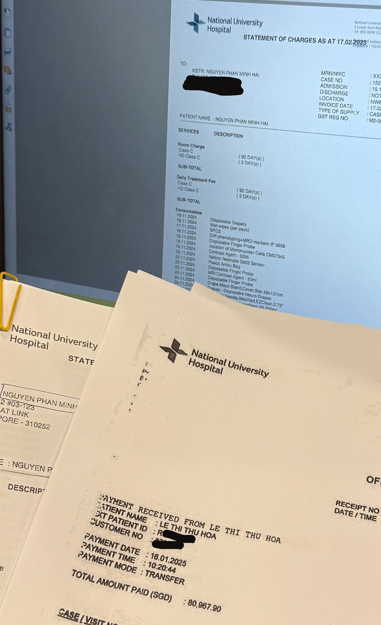 Màn hình lớn trong phiên livestream hiển thị tài khoản thiện nguyện chính thức mở từ 4/11/2024. Trước hàng trăm nghìn người xem, Phạm Thoại công khai các hóa đơn của bệnh viện ở Singapore - nơi bé Bắp điều trị. Quá trình nhận, rút tiền kèm các mốc thời gian cũng được công bố.