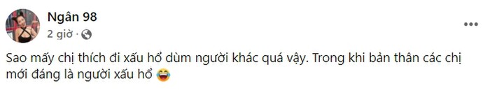 Mới đây trên trang cá nhân, Ngân 98 bày tỏ sự bức xúc vì bị một tài khoản nhắn tin đến mắng là làm xấu hổ phụ nữ Việt Nam do thường xuyên mặc đồ hở hang. Bạn gái Lương Bằng Quang viết: "Sao mấy chị thích đi xấu hổ giùm người khác quá vậy? Trong khi bản thân các chị mới đáng là người xấu hổ?".