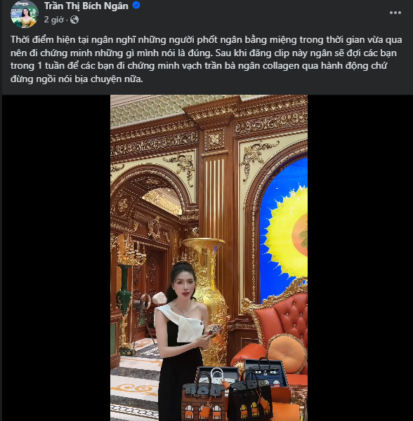Mặc dù có trong tay giấy tờ mua đồng hồ, túi Hermes nhưng Ngân Collagen không đăng lên. Bởi vì cô cho rằng cộng đồng mạng sẽ cho rằng cô đã chỉnh sửa ảnh hoặc mua giấy tờ giả.Vậy nên, cô sẵn sàng tặng đồng hồ hơn 11 tỷ cho ai tìm được bằng chứng cô “phông bạt”.