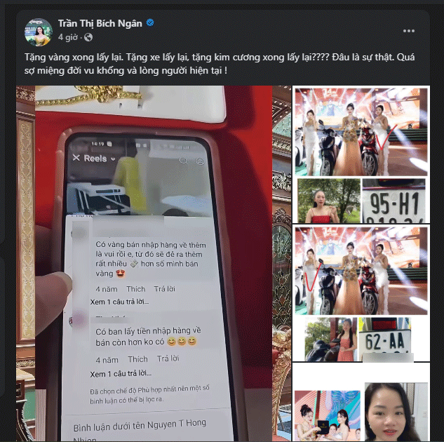 Sau khi nắm được thông tin, vào chiều ngày 3/6, Ngân Collagen đã tung loạt clip đính chính. Về tin đồn “Tặng xe lấy lại, tặng kim cương xong lấy lại”, cô đã đăng clip kèm hình ảnh những nhân viên nhận được quà lên tiếng. Cụ thể, những người này khẳng định đã được tặng xe máy, vàng, kim cương,… kèm giấy tờ xác minh.