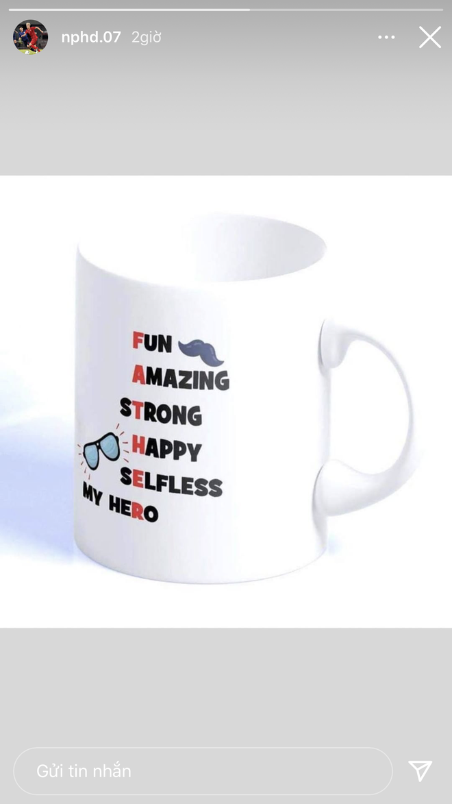 Nguyễn Phong Hồng Duy không chia sẻ nhiều mà gửi gắm thông điệp qua hình ảnh chiếc cốc in tất cả những điều tốt nhất làm nên một người bố: Hài hước, tuyệt vời, mạnh mẽ, hạnh phúc, vị tha, anh hùng của con.