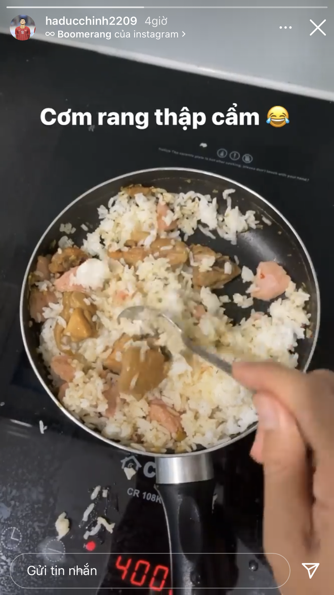 Với hội có tâm hồn ăn uống, không thể bỏ qua thủ tục check-in hôm nay ăn gì. Chẳng hạn như Hà Đức Chinh hoá trai đảm khi tự tay làm cơm rang thập cẩm.