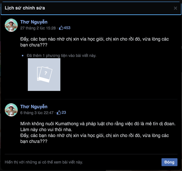 Sau khi chỉnh sửa (22h47 ngày 6/3): "Mình không nuôi Kumanthong và pháp luận cho rằng việc đó là mê tín dị đoan. Làm này cho vui thôi nha. Đấy, các bạn nào nhờ chị xin vía học giỏi, chị xin cho rồi đó, vừa lòng các bạn chưa???".