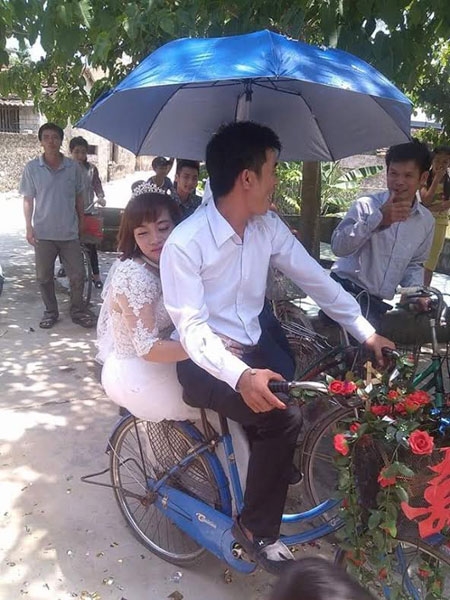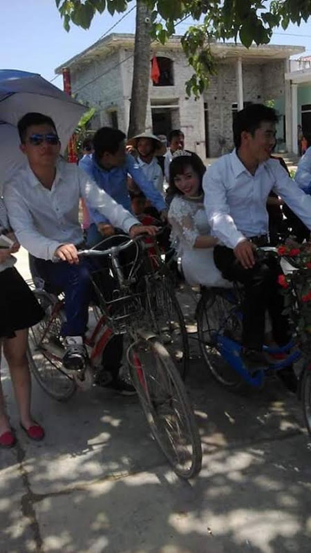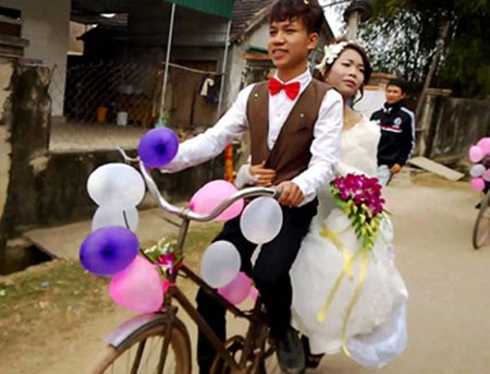 Thay vì rước cô dâu trong bộ váy cưới trên chiếc xế hộp sang trọng thì một chú rể Trần Đình Quang (sinh năm 1993) ở xã Nam Anh, huyện Nam Đàn, Nghệ An lại quyết định rước cô dâu Nguyễn Thúy Tĩnh bằng một chiếc xe đạp cà tàng. |