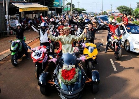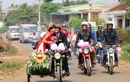 Đôi bạn trẻ Phan Thanh Tâm - Vũ Thị Út Thìn (cùng sinh năm 1989, ở huyện Krông Pắk, Đắk Lắk) gây chú ý với màn rước dâu bằng dàn xe Minsk. |
