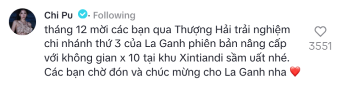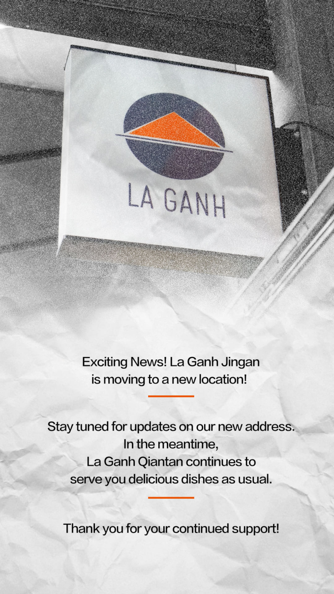 Trước đó, vào tháng 8/2024, quán cũng đã chia sẻ thông tin này trên các kênh truyền thông của mình với nội dung: "La Ganh chi nhánh Jingan đang chuyển đến địa điểm mới! Hãy theo dõi cập nhật về địa chỉ mới của chúng tôi. Trong lúc chờ đợi, La Ganh chi nhánh Qiantan sẽ tiếp tục phục vụ quý khách những món ăn ngon như thường lệ. Cảm ơn sự ủng hộ của các bạn!"