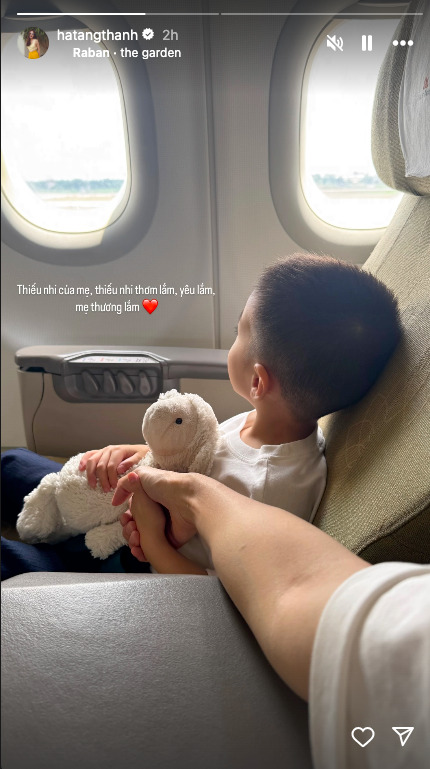 Trong ảnh, hai mẹ con ngồi cạnh nhau trên máy bay, bé Mason ôm thú bông vào lòng, ngồi ngoan ngoãn bên cạnh mẹ, còn Tăng Thanh Hà thì đặt tay lên người con, một cái nắm tay nhẹ nhưng chan chứa yêu thương. “Thiếu nhi của mẹ, thiếu nhi thơm lắm, yêu lắm, mẹ thương lắm” – dòng chữ kèm theo khiến người xem không khỏi mỉm cười vì sự dịu dàng, đầy xúc động.
