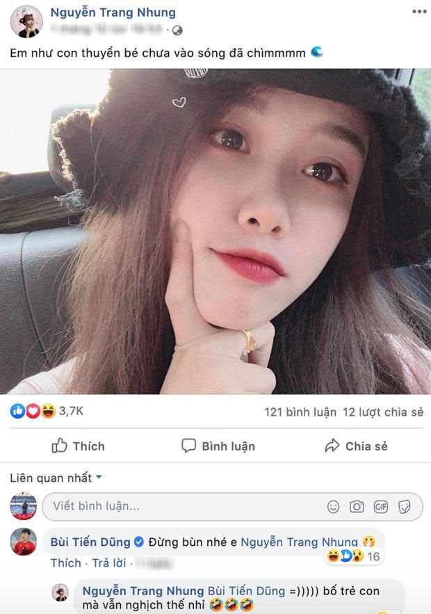 Mới đây, Trang Nhung và trung vệ Bùi Tiến Dũng vừa có một màn tương tác rất đáng yêu trên MXH khiến người hâm mộ không khỏi thích thú. Cụ thể, khi bạn gái Văn Toàn đăng một bức hình xinh đẹp của mình lên trang cá nhân kèm dòng chú thích đầy ẩn ý: "Em như con thuyền bé chưa vào sóng đã chìm", chàng cầu thủ sinh năm 1995 đã vào bình luận: "Đừng buồn nhé em, Trang Nhung".