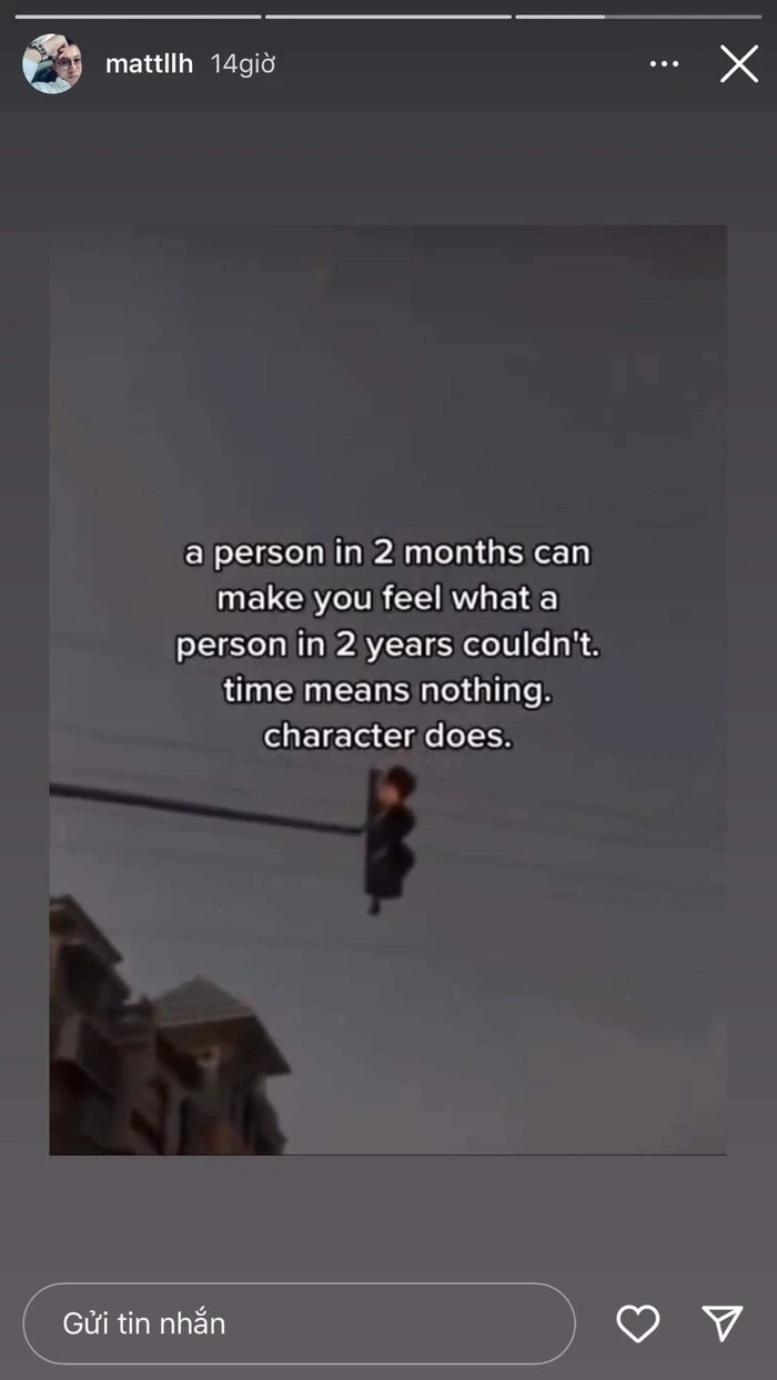 Cụ thể Matt Liu đăng tải dòng trạng thái: "Người gặp gỡ trong 2 tháng mang cho bạn cảm xúc mà người bên bạn trong 2 năm chưa từng làm. Thời gian chẳng nghĩa lý gì cả. Tính cách mới quan trọng".