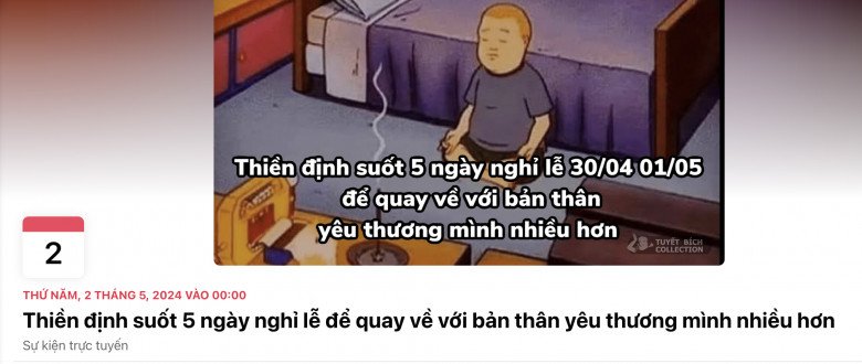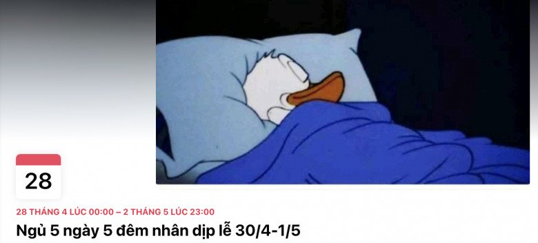Năm nay, kỳ nghỉ lễ 30/4 - 1/5 kéo dài 5 ngày nên được xem là khoảng thời gian khá dài để nghỉ ngơi sau gần nửa năm tất bật với công việc, học hành. Bên cạnh những người chọn thời điểm này để đi du lịch, về quê,... dường như nhiều người trẻ có kế hoạch khác biệt hơn khi trên mạng xã hội vài ngày gần đây lại xuất hiện loạt từ khóa hài hước như "thiền định suốt 5 ngày 5 đêm", "ngủ 5 ngày 5 đêm suốt kỳ nghỉ lễ",...
