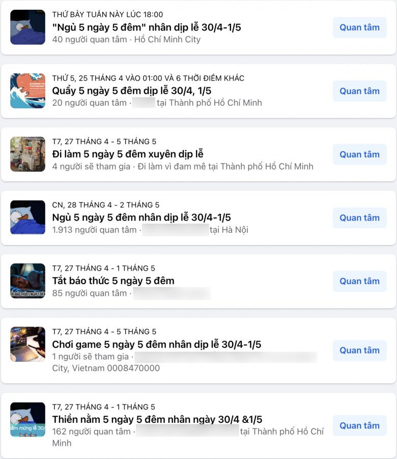Những từ khóa kể trên xuất phát từ tên các sự kiện trực tuyến được tạo ra trên Facebook. Tất cả đều là những hoạt động nghỉ lễ với mục đích dành thời gian cho bản thân, nghỉ ngơi và F5 chính mình của người trẻ. Mặc dù chỉ là sự kiện trực tuyến nhưng lại được cư dân mạng hưởng ứng nhiệt tình khi thu hút hơn 20.000 người click "tham gia" hoặc "quan tâm".
