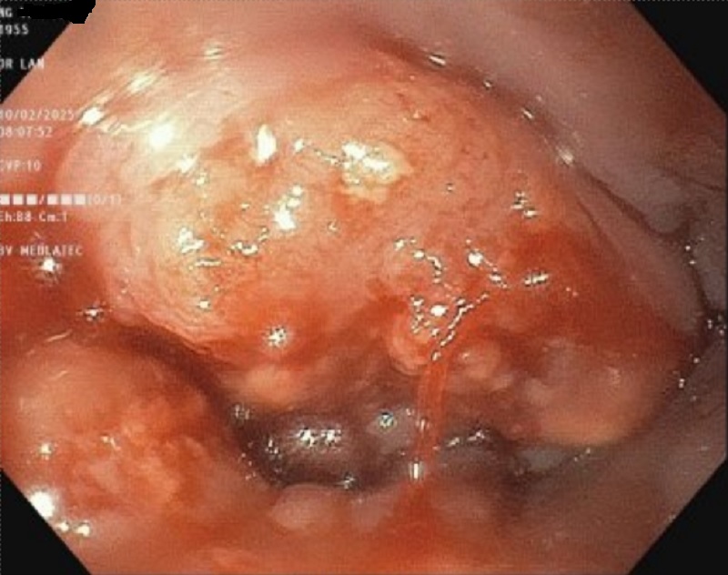 Kết quả hình ảnh nội soi thực quản phát hiện tổn thương u sùi loét chiếm 3/4 chu vi lòng thực quản, kéo dài xuống dưới một đoạn khoảng 7cm gây hẹp lòng thực quản, bề mặt nham nhở mất cấu trúc, chạm vào cứng, dễ chảy máu.