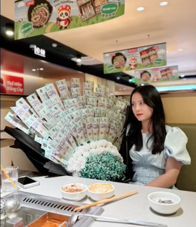 Tổng số tiền được gắn lên bó hoa của anh Cường là 50 triệu đồng. Nhân viên của một cửa hàng đã làm trong 3 ngày mới xong. Với món quà này, anh Cường muốn vợ có thể mua sắm thoải mái.
