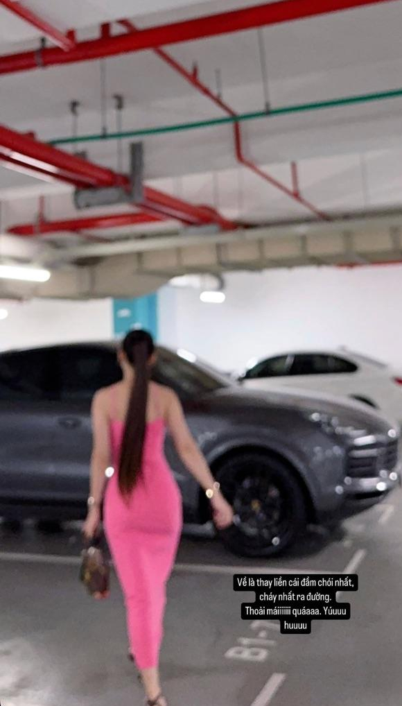 Trong bức ảnh đang được chia sẻ rần rần, Yến Xuân diện một chiếc váy bodycon ôm sát màu hồng fuchsia với sắc độ tôn da và cực kỳ nổi bật trong không gian ánh sáng mờ của hầm gửi xe. Thiết kế váy giúp nàng WAG khoe một phần tấm lưng trần nuột nà, vòng eo con kiến cùng thân hình đồng hồ cát trứ danh - thành quả của nhiều năm khổ luyện với gym và eat-clean.