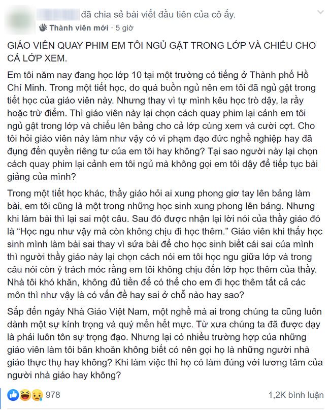 Người này cho hay, em của mình năm nay đang học lớp 10 tại một trường có tiếng ở Thành phố Hồ Chí Minh. Trong một tiết học, do quá buồn ngủ nên cậu em này ngủ gật. "Thay vì tự mình kêu học trò dậy, la rầy hoặc trừ điểm thì giáo viên này lại chọn cách quay phim cảnh em tôi ngủ gật trong lớp và chiếu lên bảng cho cả lớp cùng xem rồi cười cợt. Cho tôi hỏi giáo viên này làm như vậy có vi phạm đạo đức nghề nghiệp hay đã đụng đến quyền riêng tư của em tôi hay không? Tại sao người này lại chọn cách quay phim cảnh em tôi ngủ mà không gọi em tôi dậy để tiếp tục bài giảng của mình?" - T.C khá bức xúc chia sẻ.