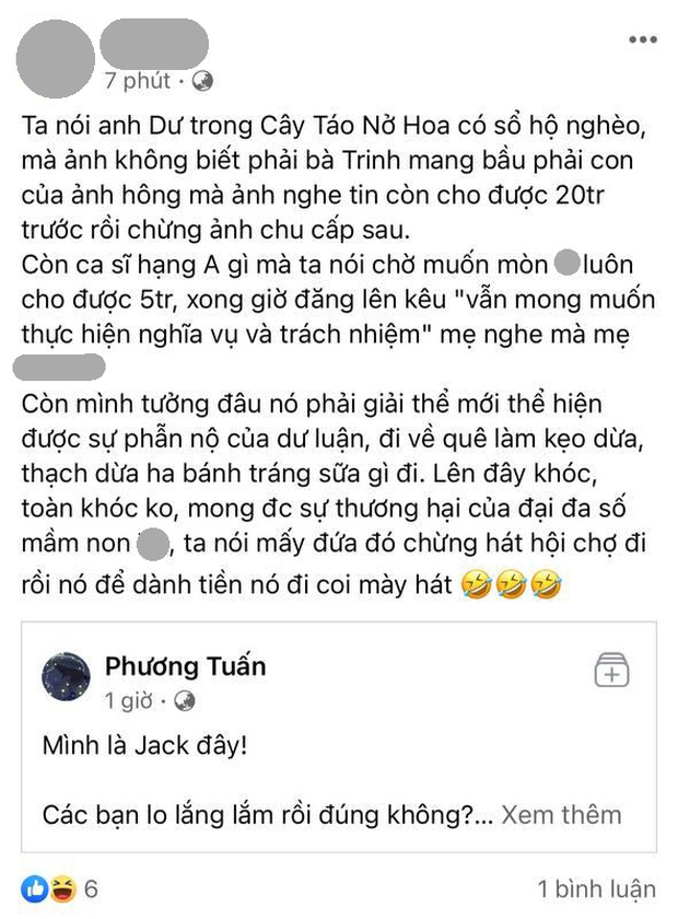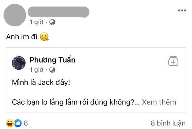 Nhiều bạn bè của Thiên An cũng mau chóng chia sẻ bài đăng và bày tỏ sự bức xúc. Có người so sánh Jack với nhân vật Dư trong Cây Táo Nở Hoa, có người lại ngắn gọn: "Anh im đi".