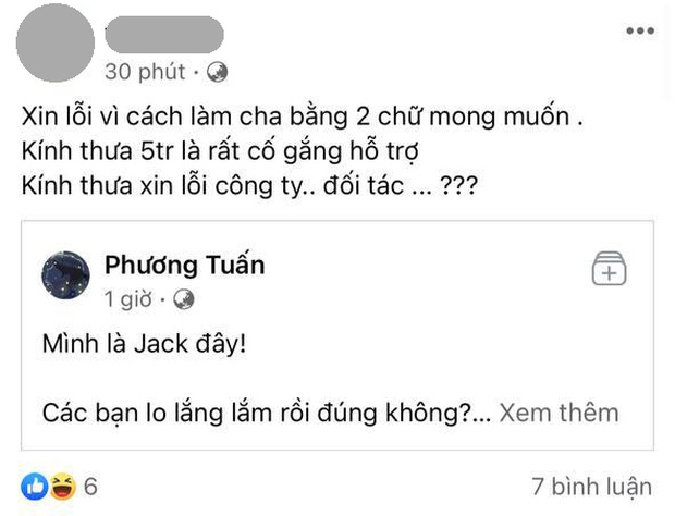 Cụ thể, T.L - em gái Thiên An viết: "Xin lỗi vì cách làm cha bằng 2 chữ mong muốn. Kính thưa 5 triệu là rất cố gắng hỗ trợ. Kính thưa xin lỗi công ty, đối tác...".