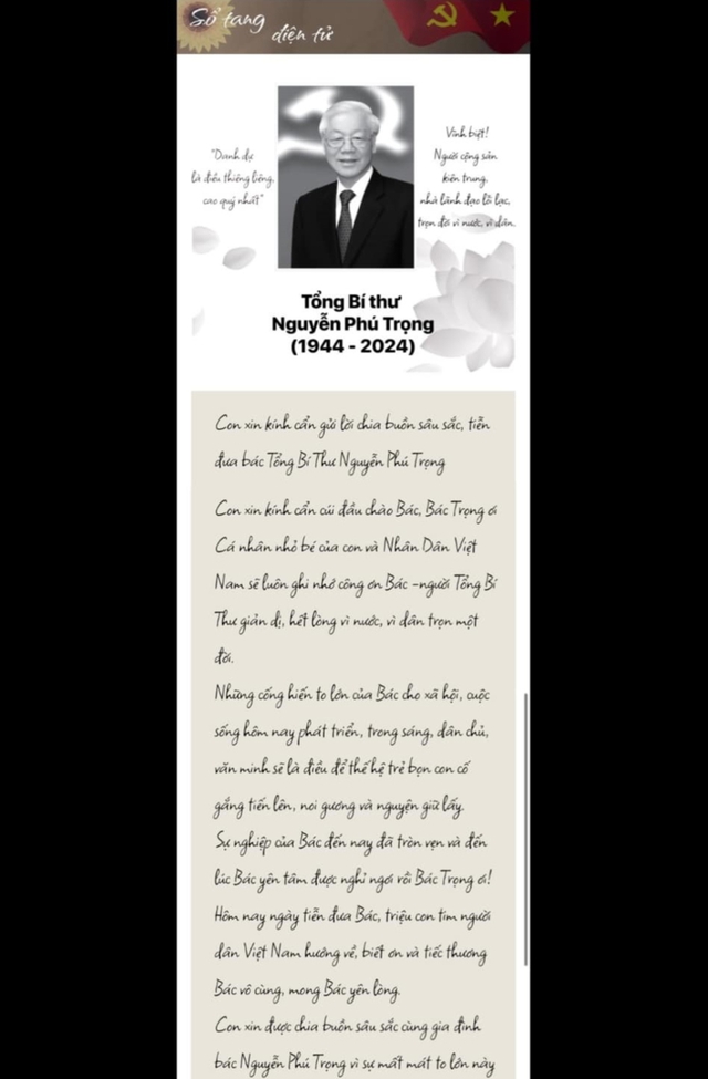 Trên các nền tảng MXH, nhiều KOL và cư dân mạng cũng chia sẻ lời chia buồn, tri ân Tổng Bí thư Nguyễn Phú Trọng trên Sổ tang điện tử VNeID.