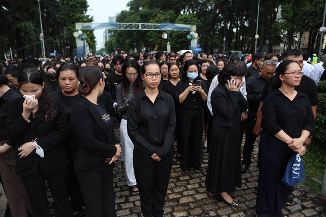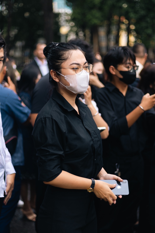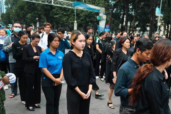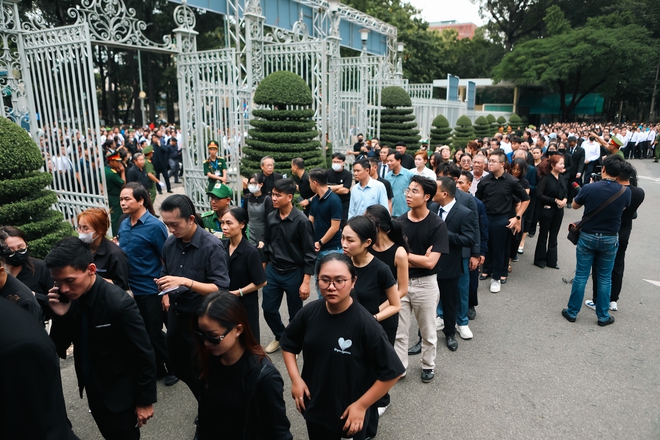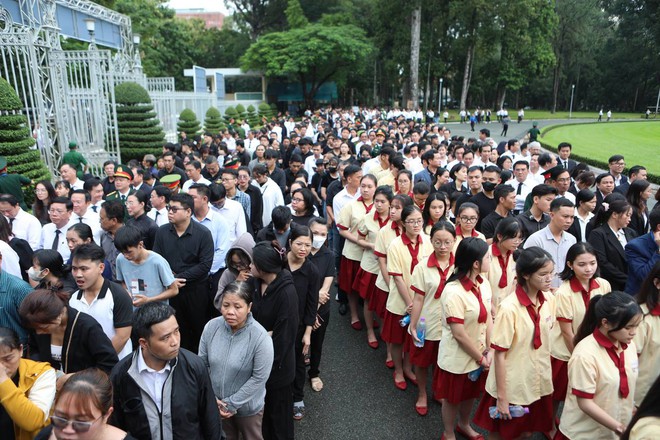 Ở Hội trường Thống Nhất (TP.HCM), bạn Đinh Thái Ngọc (Tân Phú) cho biết mình cùng các đồng nghiệp trong công ty đến viếng Tổng Bí thư. "Mặc dù rất đông nhưng mình thấy mọi người trật tự, theo sự sắp xếp của lực lượng chức năng. Có cô chú cao tuổi nhưng vẫn chịu khó xếp hàng chờ vào viếng".