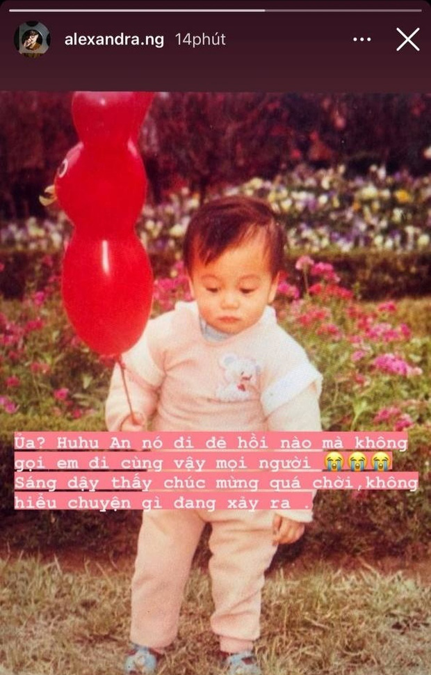 Quá bất ngờ trước sự việc này, Alex đã phải đăng đàn giải thích ngay và luôn. Alex viết trên story Instagram: "Ủa? Huhu An nó đi đẻ hồi nào mà không gọi em đi cùng vậy mọi người. Sáng dậy thấy chúc mừng quá trời, không hiểu chuyện gì đang xảy ra."