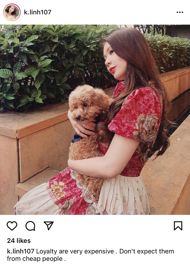 Khi cả hai đều chưa chính thức lên tiếng chuyện "đường ai nấy đi" thì mới đây, tối ngày 12/1, Khánh Linh đã có động thái mới trên Instagram. Đi cùng bức ảnh được cô đăng tải là dòng caption gây tò mò cực độ: "Loyalty are very expensive. Don't expect them from cheap people" (tạm dịch: Lòng chung thủy là thứ rất đắt đỏ. Đừng kỳ vọng nó từ một kẻ rẻ mạt).