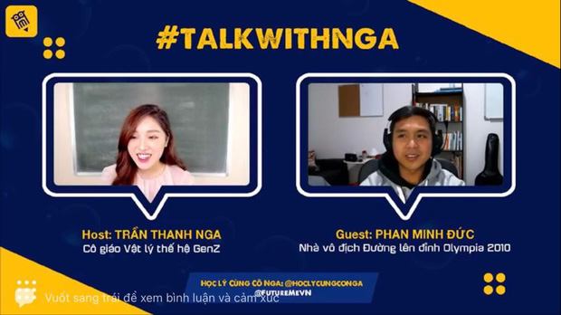 Cô giáo Thanh Nga hiện tại là một trong những giáo viên dạy online nhận được nhiều sự quan tâm của giới học trò. Cô tạo được thiện cảm và dấu ấn cho riêng mình bằng việc chỉ tập trung vào chuyên môn giảng dạy Vật lý. Mới đây, cô giáo này còn khiến dân tình ồ à vì mời được một khách mời "hạng nặng" để giao lưu với học sinh, đó là Nhà vô địch Olympia năm thứ 10 Phan Minh Đức thông qua hình thức livestream.