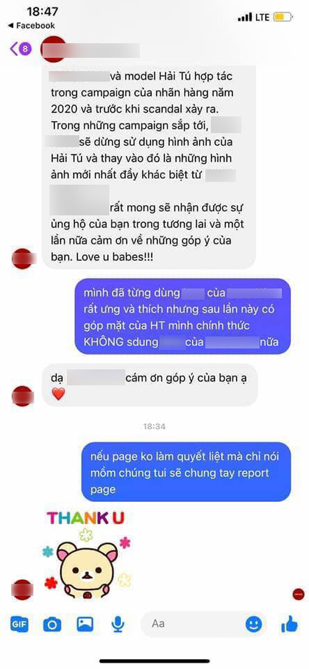 Vào ngày 30/1, hình ảnh chụp lại tin nhắn với nội dung một nhãn hàng tuyên bố sẽ ngừng sử dụng ảnh của Hải Tú bỗng rầm rộ trên mạng xã hội.