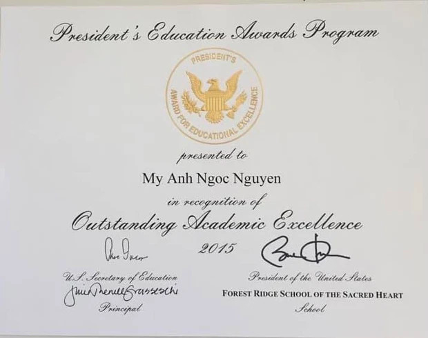 Đính kèm là bằng khen của cựu Tổng thống Mỹ Barack Obama trao tặng cho ái nữ 2k1 khi cô có thành tích xuất sắc, đứng đầu khối 8 của trường cấp 2. Bên cạnh đó, cô từng nhận được giải thưởng "Honors Award for Diligence" dành cho những học sinh nổi bật ngay từ năm đầu du học.