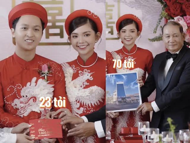 Còn phía nhà trai tặng cặp đôi những món trang sức giá trị như vòng cổ 1,6 tỷ đồng, vòng tay kim cương 1,5 tỷ đồng, cuốn "album" ngập vàng cưới, 2 tấm séc trị giá 5 tỷ đồng… và một căn nhà tại New York có giá 2 triệu USD (khoảng 46 tỷ đồng). Đây cũng là tổ ấm mà cặp đôi đang sinh sống tại Mỹ.