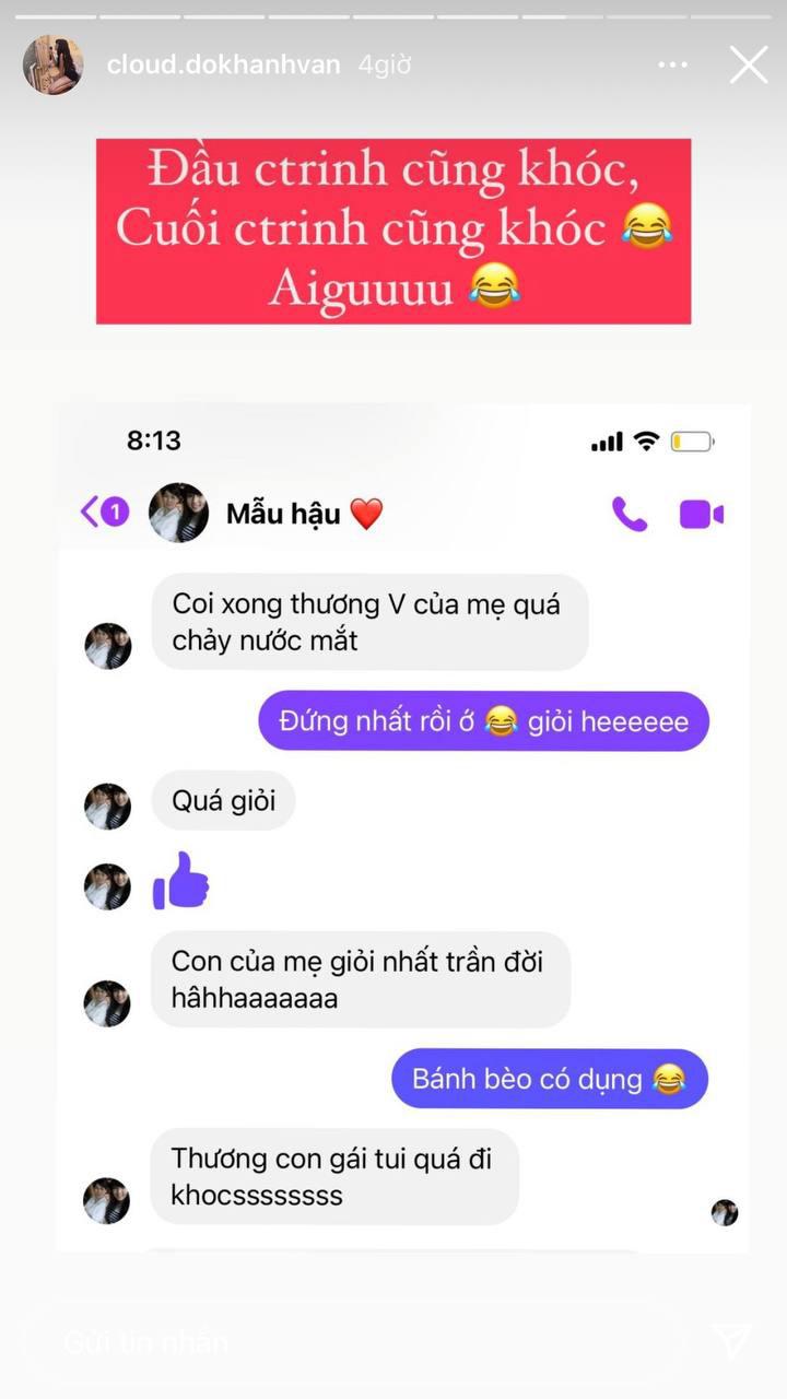 Không chỉ khi thấy kết quả của con gái thì mẹ Khánh Vân mới khóc. Theo cô nàng Trà Long chia sẻ, mẹ của cô đã khóc ngay từ đầu chương trình. "Đầu chương trình cũng khóc. Cuối chương trình cũng khóc" - cô chia sẻ.