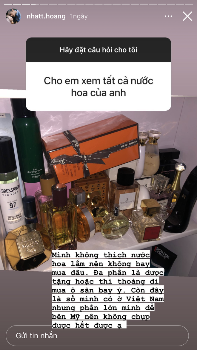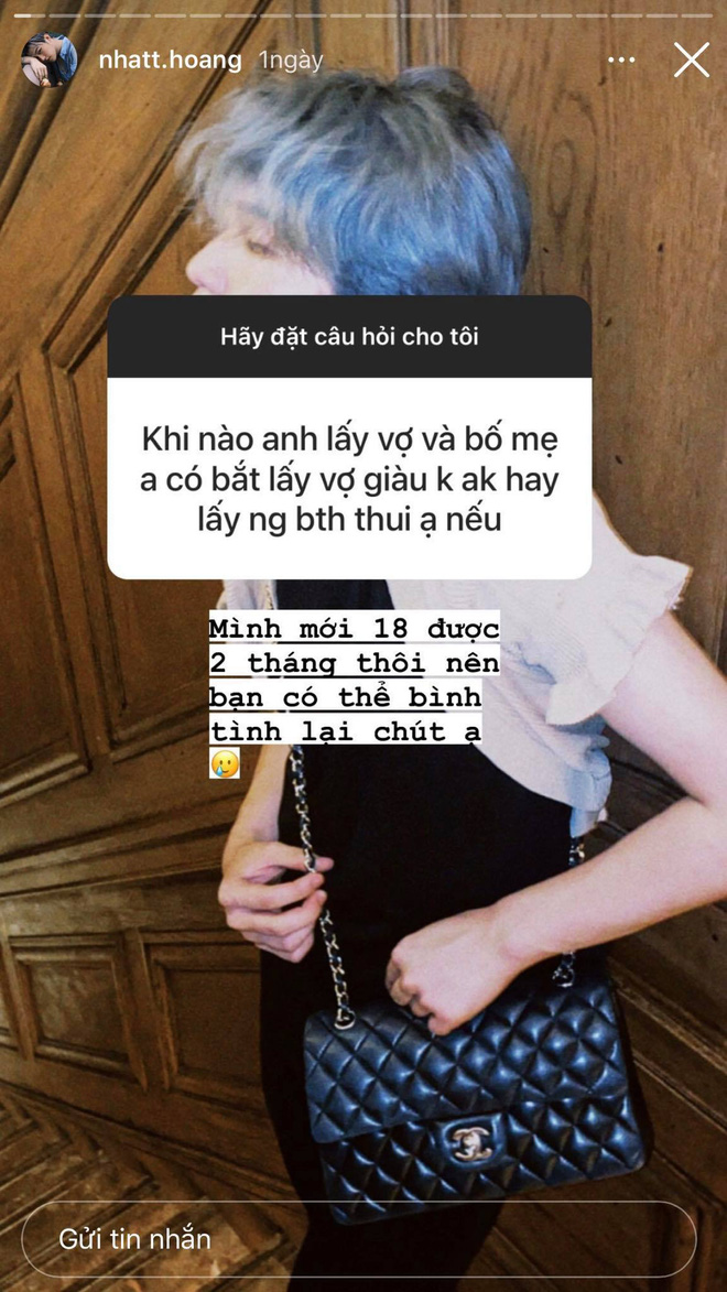 Cũng trong lần Q&A này, Nhất Hoàng giải đáp thêm một số câu hỏi đáng chú ý. Khi được hỏi về chuyện tương lai như kết hôn và yêu cầu của gia đình với vấn đề này, Nhất Hoàng cho biết: "Mình mới 18 tuổi được 2 tháng thôi nên bạn có thể bình tĩnh lại chút ạ". Với câu hỏi về BST nước hoa, rich kid chỉ có thể hé lộ một phần nhỏ ở Việt Nam bởi anh chàng để phần lớn ở Los Angeles.