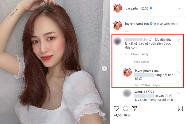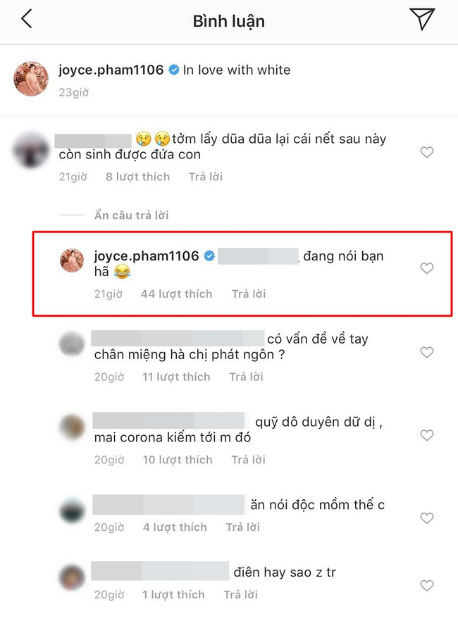 Cách hành xử xấu xí này không chỉ khiến chính chủ bức xúc mà đến cộng đồng mạng cũng phải khó chịu thay cô. Joyce Phạm cũng không rõ vì sao cô bị ghét, nhưng bình luận ác ý ở trên có nhắc đến em bé chưa chào đời trong bụng cô nên bà mẹ trẻ đã phải lên tiếng đáp trả lại: "Bạn đang nói bạn hả?". Pha "phản dame" đơn giản nhưng đầy ngoạn mục khiến ai cũng hả hê.