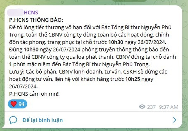 "Để bày tỏ lòng thành kính và tiếc thương sâu sắc với sự mất mát to lớn của đất nước, công ty xin trân trọng thông báo tạm dừng mọi hoạt động làm việc trong ngày Quốc tang Tổng Bí thư Nguyễn Phú Trọng".