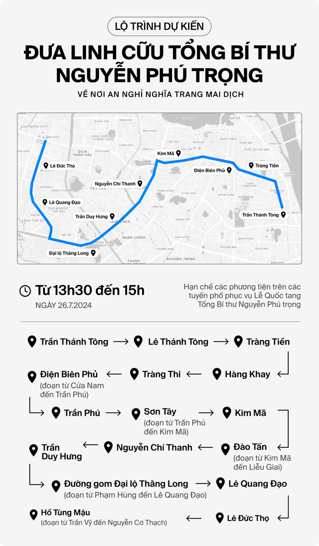 Theo lộ trình dự kiến, đầu giờ chiều ngày 26/7, linh cữu Tổng Bí thư Nguyễn Phú Trọng sẽ được di chuyển qua nhiều tuyến phố Thủ đô để về Nghĩa trang Mai Dịch.