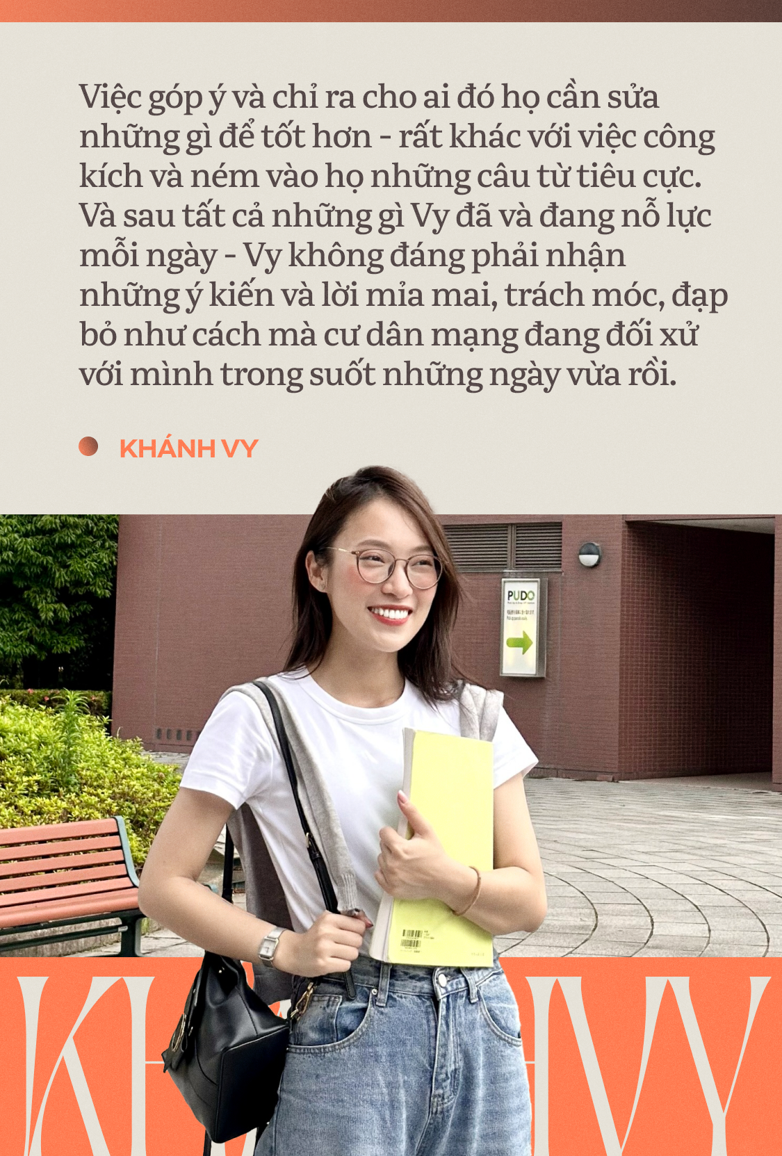 Tôi không có ý định nói rằng những bình luận của cư dân mạng là không đúng. Vy có những khuyết điểm khi dẫn một chương trình mang tính giải trí hoặc cần đòi hỏi kỹ năng đào sâu tâm lý. Vy cũng có những thói quen chưa đúng lắm trong cách sử dụng tiếng Anh để chia sẻ lại với các khán giả của mình. Vy thể hiện cho người ta thấy một hình ảnh và năng lượng hơi nồng nhiệt quá mức. Không ai trong chúng ta hoàn hảo và Vy cũng vậy. Vy vẫn còn rất trẻ và mới trải nghiệm công việc này một cách nghiêm túc trong vài năm gần đây. Tất cả những điều đó là cảm nhận chung, và là những thiếu sót mà Vy cần điều chỉnh để làm hài lòng khán giả và hoàn thiện hơn cho công việc của mình. Nhưng, việc góp ý và chỉ ra cho ai đó họ cần sửa những gì để tốt hơn - rất khác với việc công kích và ném vào họ những câu từ tiêu cực. Và sau tất cả những gì Vy đã và đang nỗ lực mỗi ngày - Vy không đáng phải nhận những ý kiến và lời mỉa mai, trách móc, đạp bỏ như cách mà cư dân mạng đang đối xử với mình trong suốt những ngày vừa rồi.