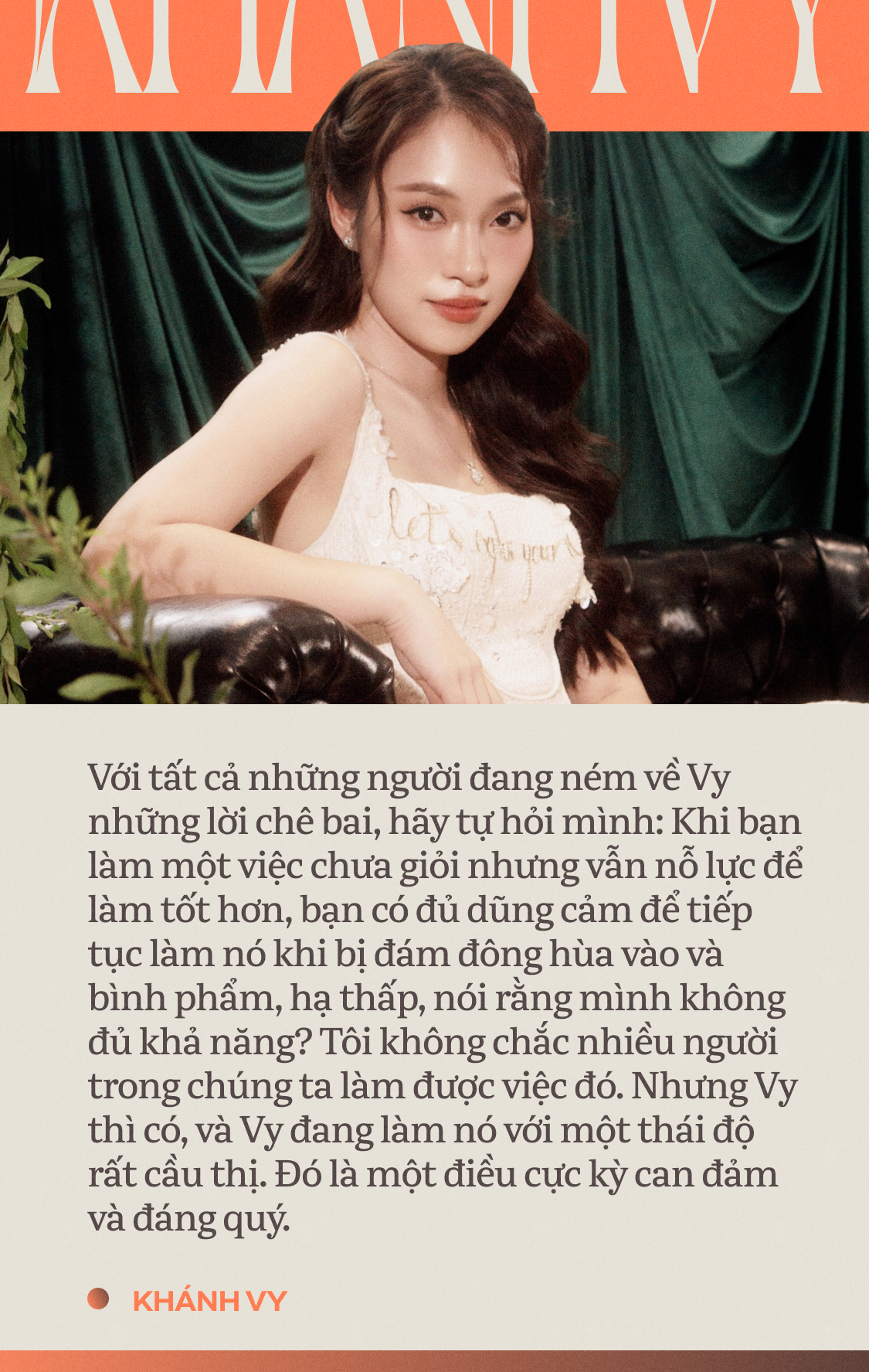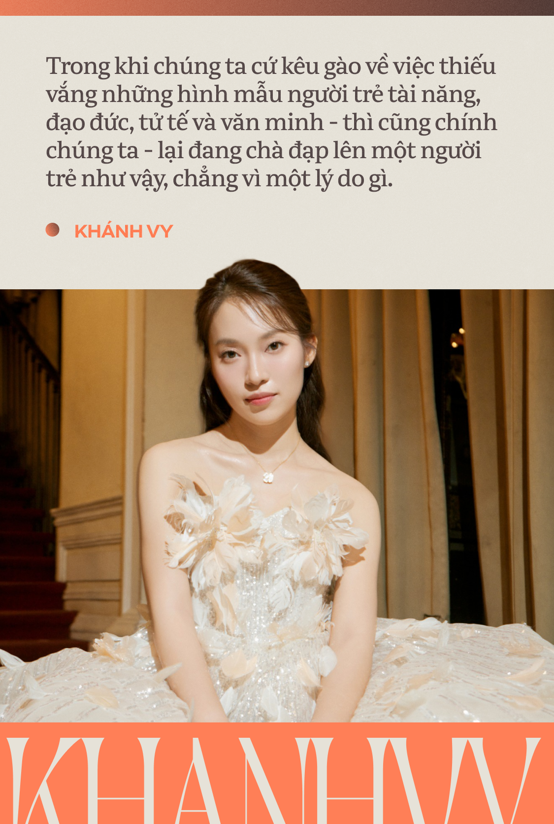 Một người trẻ chăm chỉ, cầu tiến, lao động nghiêm túc, luôn tìm cách lan tỏa những góc nhìn tích cực về cuộc sống và nỗ lực để tự hoàn thiện bản thân - đó là điều khiến Khánh Vy trở thành một cô gái tuyệt vời, chứ không chỉ là bảng thành tích hay những danh xưng mà người ta tán thưởng về Vy. Với tất cả những người đang ném về Vy những lời chê bai, hãy tự hỏi mình: Khi bạn làm một việc chưa giỏi nhưng vẫn nỗ lực để làm tốt hơn, bạn có đủ dũng cảm để tiếp tục làm nó khi bị đám đông hùa vào và bình phẩm, hạ thấp, nói rằng mình không đủ khả năng? Tôi không chắc nhiều người trong chúng ta làm được việc đó. Nhưng Vy thì có, và Vy đang làm nó với một thái độ rất cầu thị. Đó là một điều cực kỳ can đảm và đáng quý.