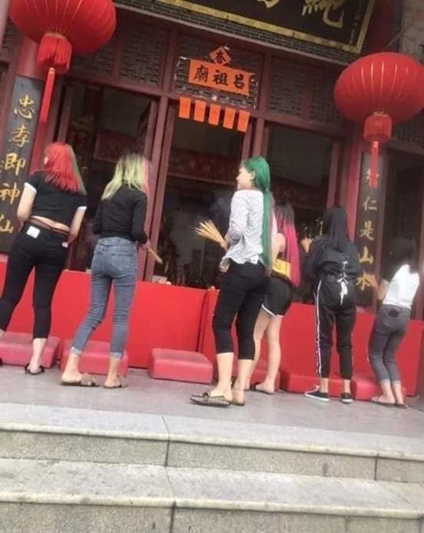 23/07/2019 22:18Nhóm bạn gái nhuộm tóc xanh đỏ, diện hẳn đồ ngủ hở rốn lên chùa cầu may gây tranh cãi