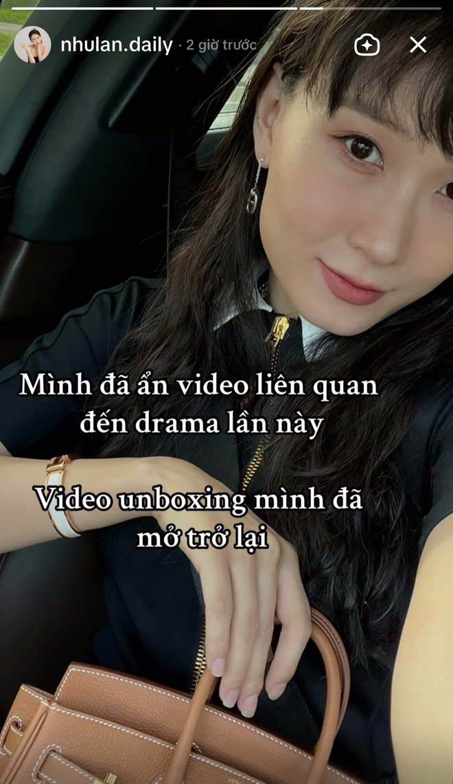 Ngoài ra cô cũng đăng thêm ảnh hộp màu xanh của chiếc túi Hermes ô cửa sổ và viết: "Kỷ niệm không vui, thì cũng là kỷ niệm". Trên thân hộp có ghi "Chiếc cửa sổ drama 04/05/2025" kèm theo chữ ký của Như Lan.