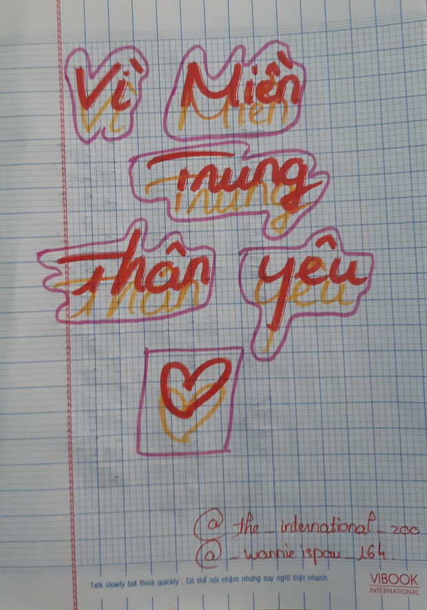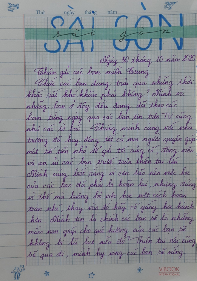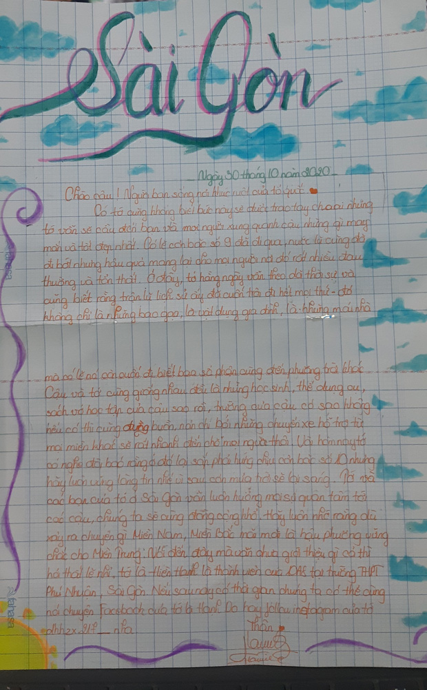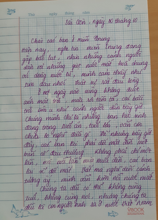 "Giờ văn của chúng mình cô hay cho tụi em thoả sức sáng tạo với rất nhiều chủ đề khác nhau nhưng mà lần này thì đang có lũ lụt ngoài miền Trung, bài hôm ấy mình học là phong cách ngôn ngữ sinh hoạt nên thay vì chép bài thì cô nói lớp mình hãy viết thư để gửi cho các bạn miền Trung cũng như là để thực hành bài học. Cảm xúc của mình lúc đó thì cũng rất là đồng cảm với các bạn ngoài ấy, mình đọc tin tức trên mạng xã hội cũng như một số báo mạng nhìn thấy tình trạng nhà cửa tan hoang mình rất xót xa và đồng cảm sâu sắc với các bạn miền Trung. Với những cảm xúc đó mình viết lá thư này như muốn động viên tinh thần của các bạn trước thiên tai lớn lần này." - Tâm sự của bạn Khả Ái (học sinh lớp 10A8 - THPT Phú Nhuận).
