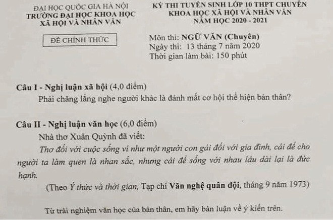 Trong kỳ thi tuyển sinh lớp 10 Văn của THPT chuyên Khoa học Xã hội & Nhân văn xuất hiện câu hỏi Nghị luận văn học có nội dung: "Nhà thơ Xuân Quỳnh đã viết: 'Thơ đối với cuộc sống ví như một người con gái đối với gia đình, cái để cho người ta làm quen là nhan sắc, nhưng cái để sống với nhau lâu dài lại là đức hạnh' (Theo Ý thức và thời gian, Tạp chí Văn nghệ quân đội, tháng 9 năm 1973). Từ trải nghiệm văn học của bản thân, em hãy bàn luận về ý kiến trên".