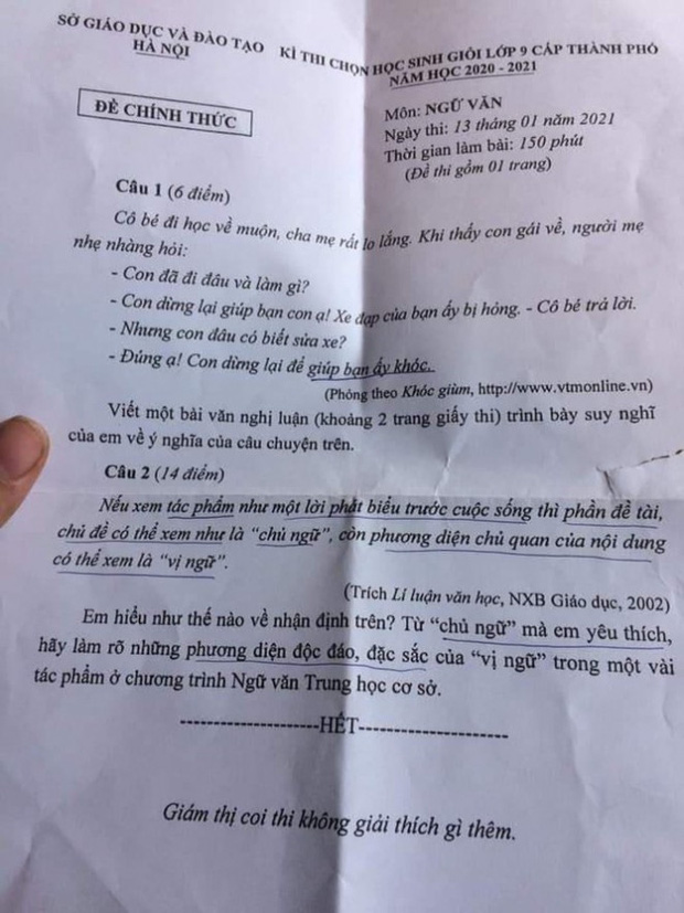 Mấy ngày qua, cộng đồng mạng đang thi nhau bàn tán rôm rả, thậm chí đưa ra rất nhiều quan điểm tranh luận về câu nghị luận xã hội trong đề thi chọn học sinh giỏi lớp 9 cấp thành phố môn Ngữ văn của Hà Nội, năm học 2020 - 2021. Theo đó, đề bài yêu cầu học sinh viết một bài văn nghị luận (khoảng 2 trang giấy thi), trình bày suy nghĩ về ý nghĩa của một mẩu truyện cười.