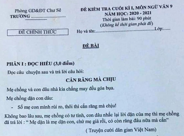 Mới đây, dân mạng lại được phen dở khóc, dở cười sau khi đọc đề thi học kỳ môn Văn của học sinh lớp 9 ở huyện Chư Sê, tỉnh Gia Lai. Theo đó, trong phần Đọc - hiểu chiếm 3 điểm, đề bài trích 1 mẩu truyện cười dân gian để đưa ra các câu hỏi yêu cầu học sinh trả lời. Sẽ không có gì đáng nói nếu đoạn trích được sử dụng có ý nghĩa, nội dung chuẩn chỉnh, có tính giáo dục, song đề bài này lại thể hiện rõ mồn một chuyện nhạy cảm... mẹ chồng có bồ.