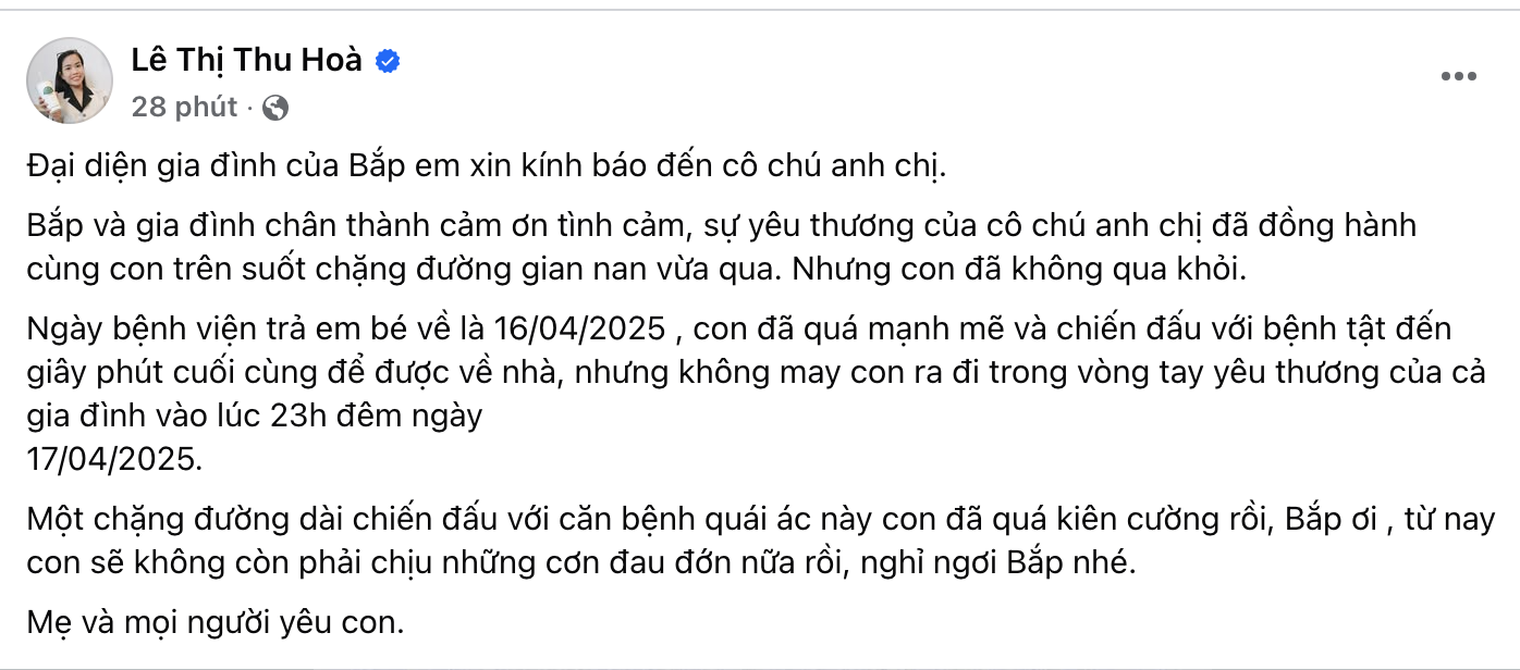 Theo chia sẻ của Thu Hoà - mẹ Bắp vào sáng ngày 18/4, “ngày bệnh viện trả em bé về là 16/04/2025, con đã quá mạnh mẽ và chiến đấu với bệnh tật đến giây phút cuối cùng để được về nhà, nhưng không may con ra đi trong vòng tay yêu thương của cả gia đình vào lúc 23h đêm ngày 17/04/2025”.