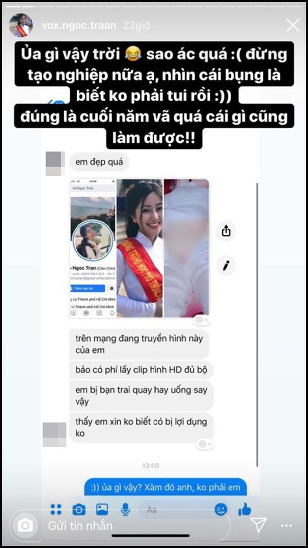 Cụ thể, khi nhận được tin nhắn doạ tung "clip full HD" trong lúc uống say thì gái xinh đã vô cùng bàng hoàng. Cô nàng viết lên story: "Ủa gì vậy trời? Sao ác quá! Đừng tạo nghiệp nữa ạ. Nhìn cái bụng là biết không phải tui rồi".