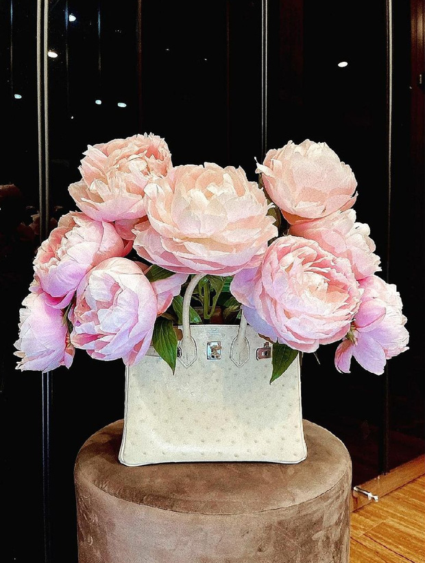 Không biết hội chị em bình thường hay cắm hoa vào đâu, chỉ biết Thanh Tú mùa dịch rảnh rỗi vừa muốn ngắm hoa lẫn ngắm túi liền nảy ngay ra sáng kiến lấy túi hiệu mấy trăm triệu làm lọ cắm vài cành mẫu đơn cho xinh. Hoan hô cho sáng kiến thấy là xót hộ của rich kid nào!